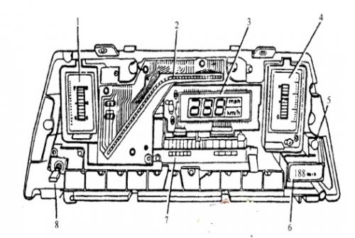 圖3數(shù)字式車速表1燃油表;2轉(zhuǎn)速表;3車速表;+溫度表;5蜂鳴器;6車速報警燈;7車速傳感器;8放大顯示開關(guān)